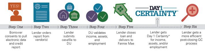 Fannie Mae’s Desktop Underwriter® (DU) validation service is designed to provide lenders with enhanced loan origination controls, process efficiency, and certainty around borrower income, assets, and employment input into DU. Fannie Mae has an open platform for data vendor participation to provide a range of options for customers. Lenders may participate in the DU validation service through relationships with vendors of their choice that can provide Day 1 Certainty verification reports accepted by Fannie Mae.